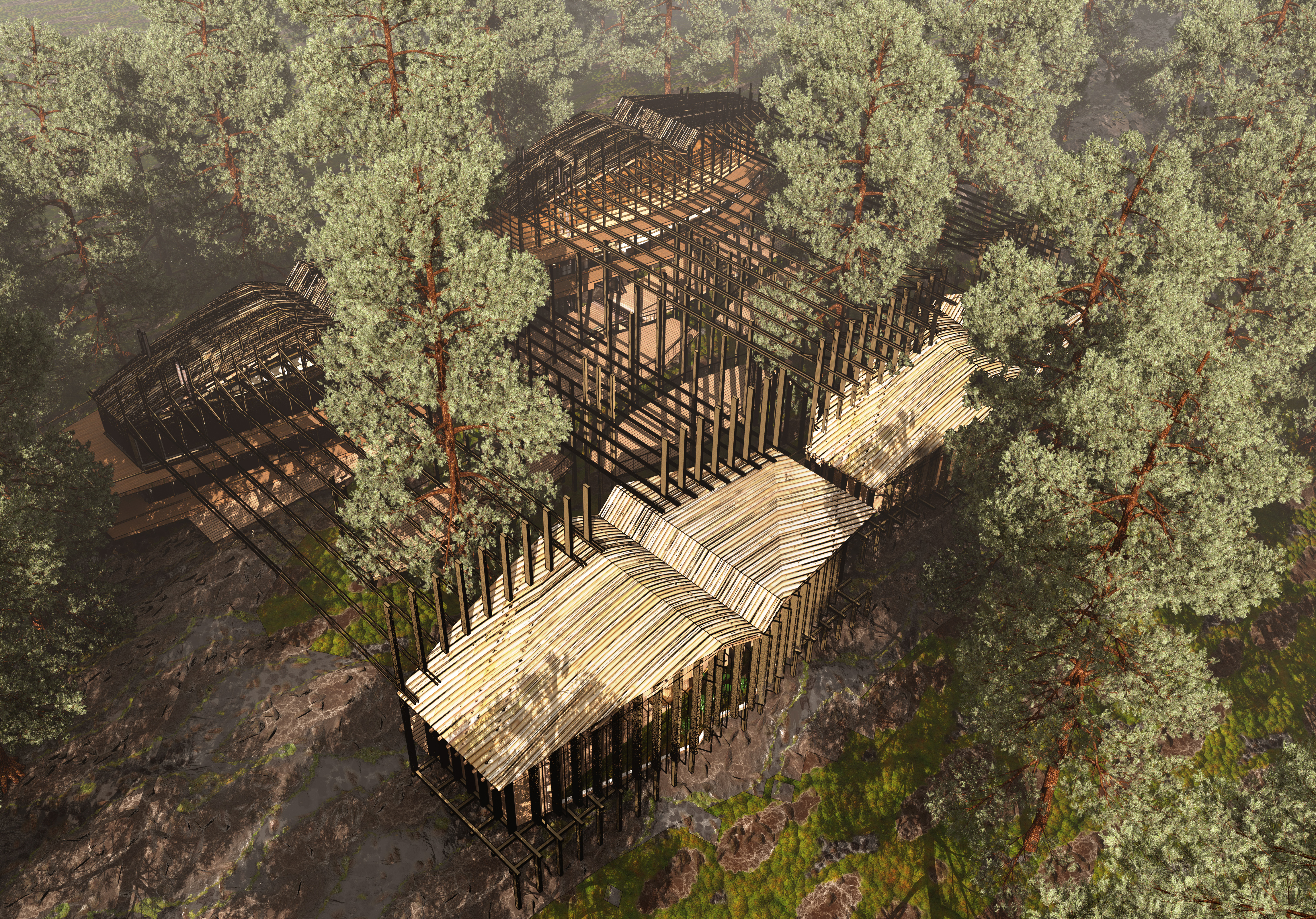 The centre comprises of a library, textile workshop, sauna and café, offering entry-level education on the forest at all levels. Spaces intended to accommodate forest creatures are integrated into the building fabric, so as to allow human users of the building to observe and learn from them, in order to further spread awareness about non-human neighbours and how easy it could be to integrate them into our lives, building symbiosis and understanding.